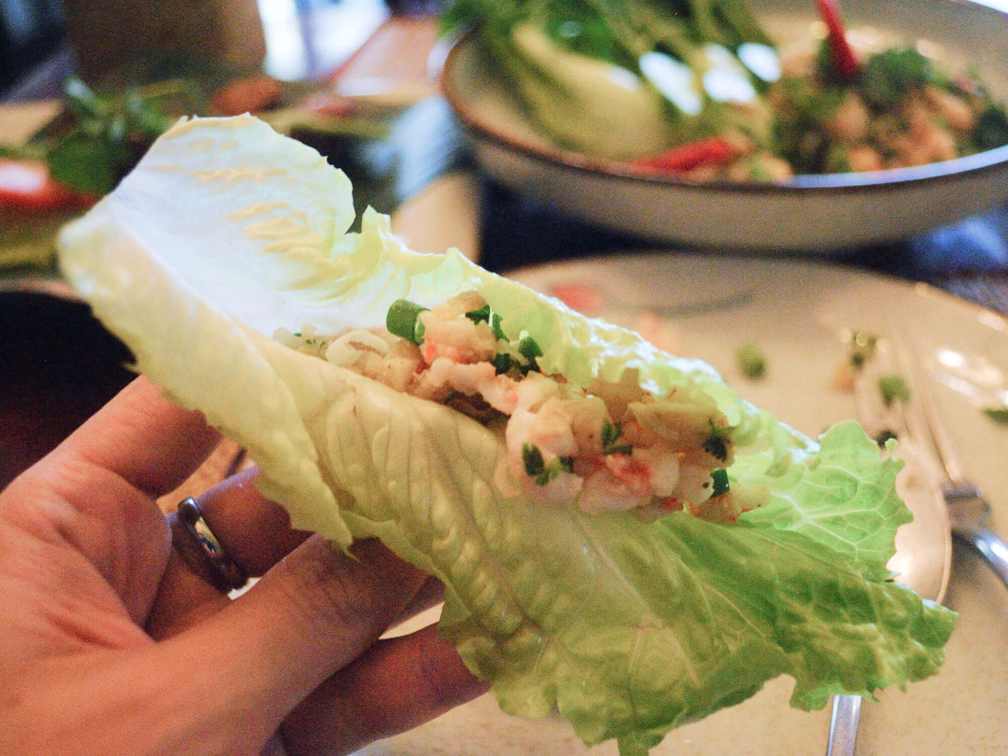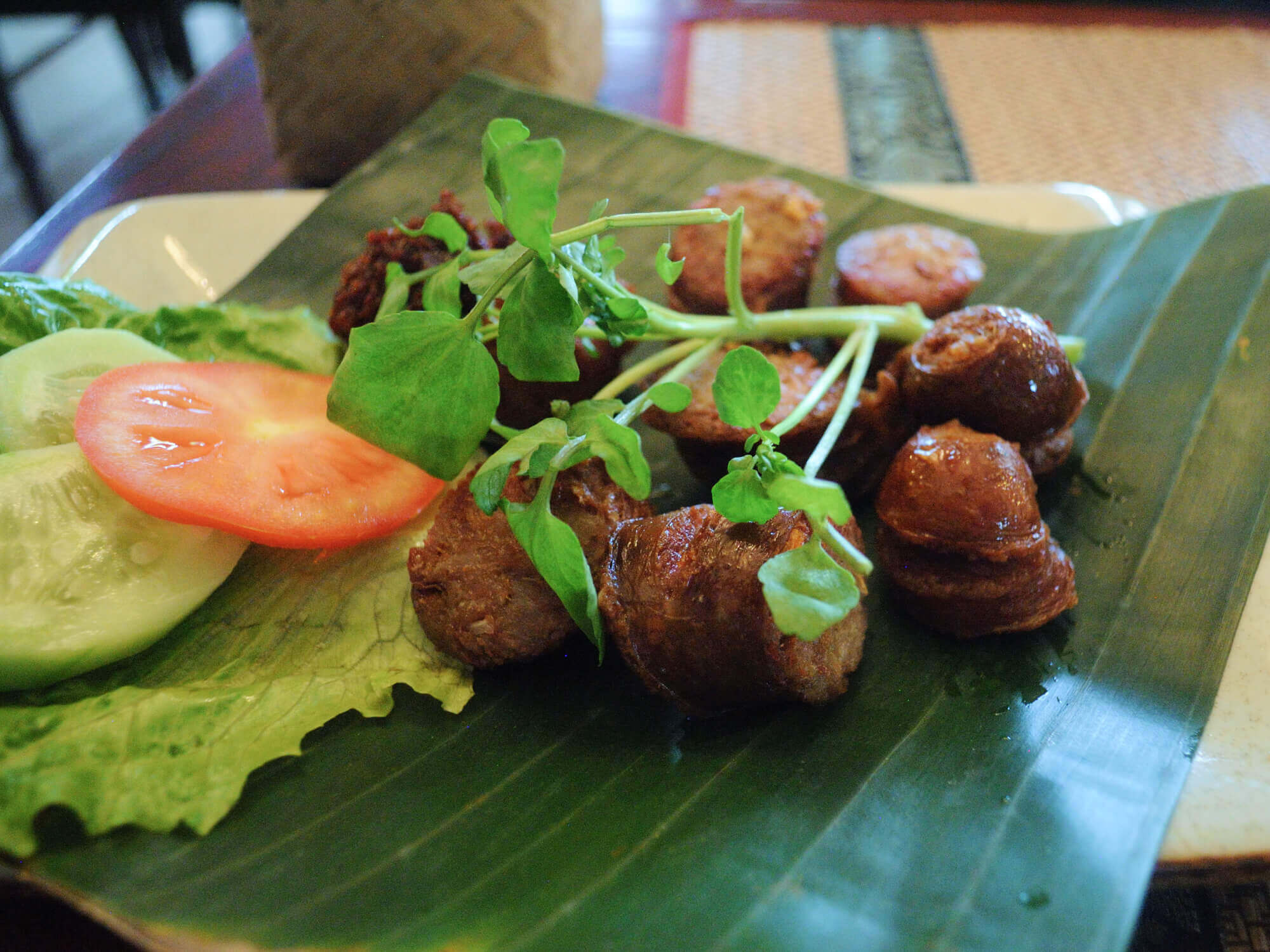 ラープとルアンパバーンソーセージとマンゴースムージー。